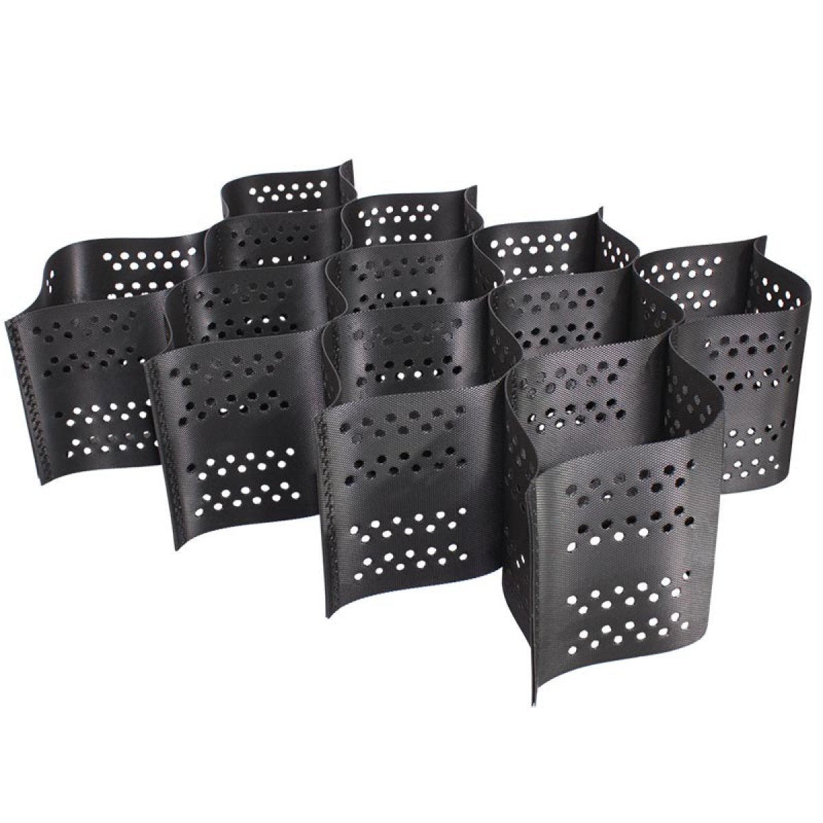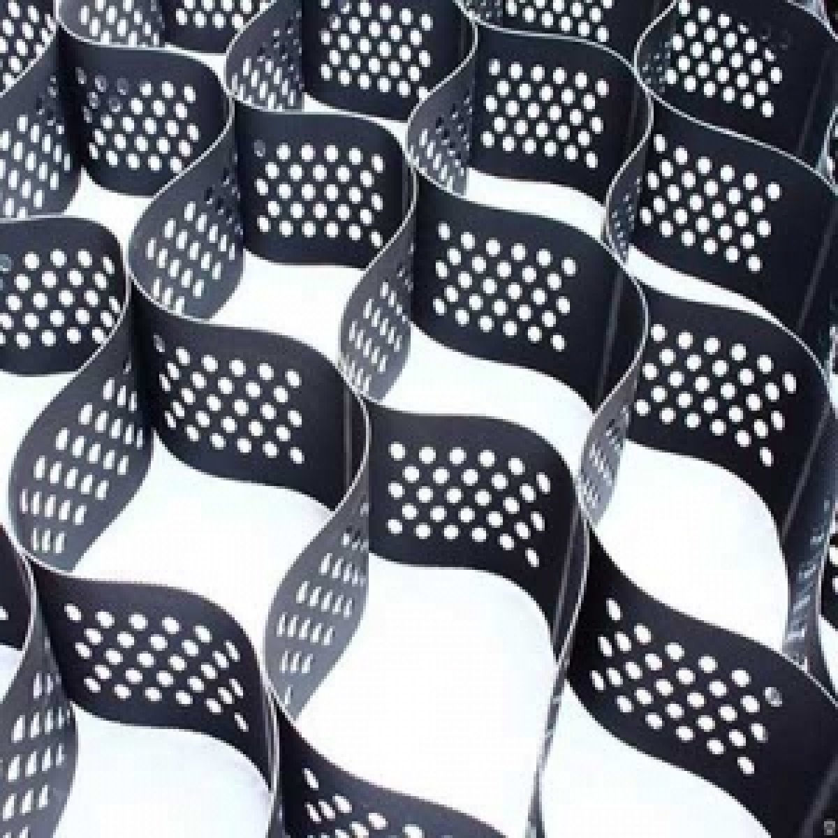 Объемная георешетка производится из полимерных лент, выполненных методом экструзии из полиолефинового гранулята, пропитывается стабилизатором и скрепляется лазерной сваркой. В зависимости от цели использования, может быть как без, так и с перфорацией.